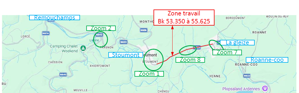 Le trafic depuis Stoumont vers Trois Ponts, et depuis Trois Ponts vers Stoumont, sera dévié par Basse Bodeux – Neufmoulin (N66) et Targnon (N645 Vallée de La Lienne), dans les deux sens de circulation.