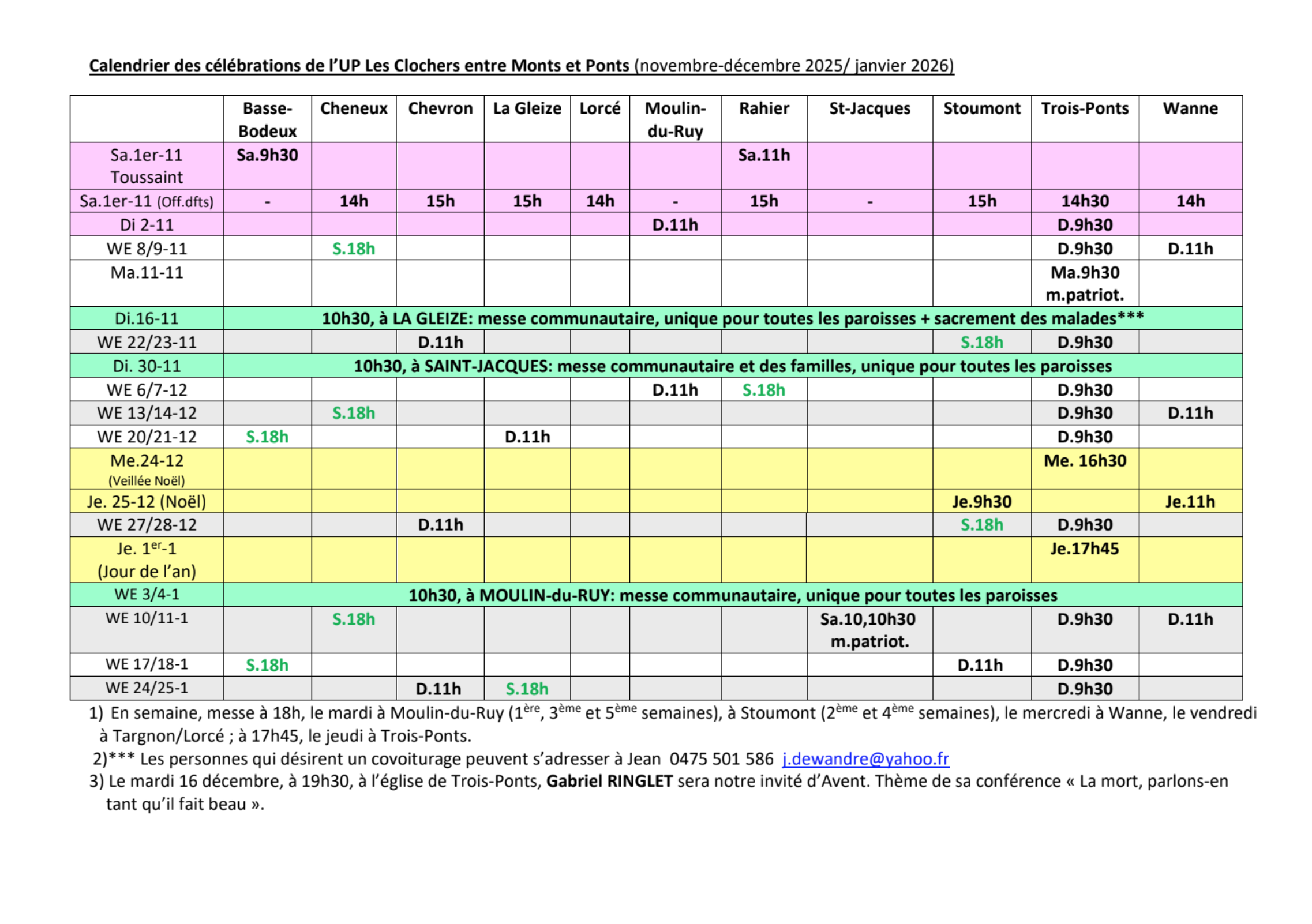 Calendrier des célébrations de l’UP Les Clochers entre Monts et Ponts (Novembre – décembre 2025 et janvier 2026)