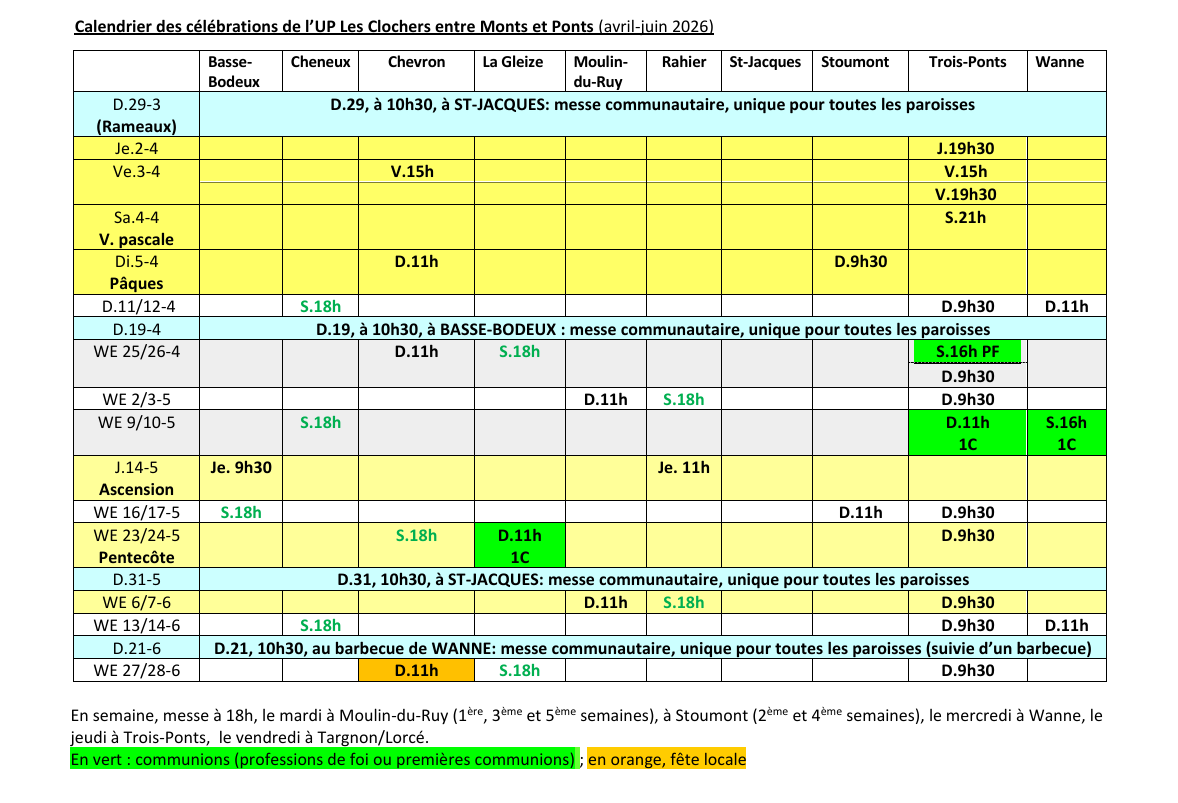 Calendrier des célébrations de l’UP Les Clochers entre Monts et Ponts (avril-juin 2026)